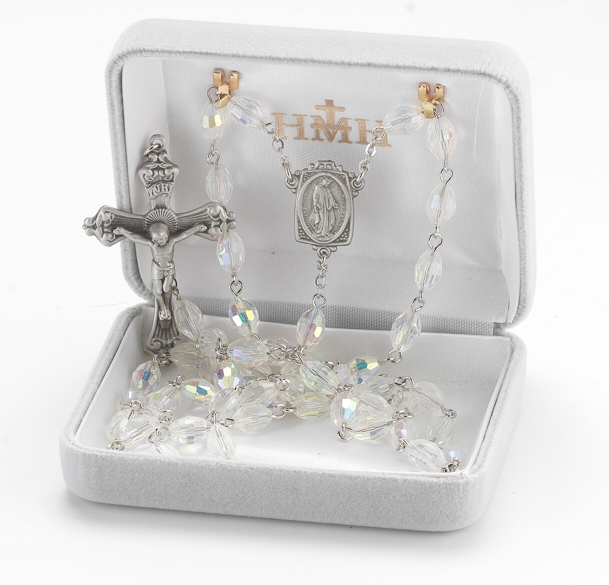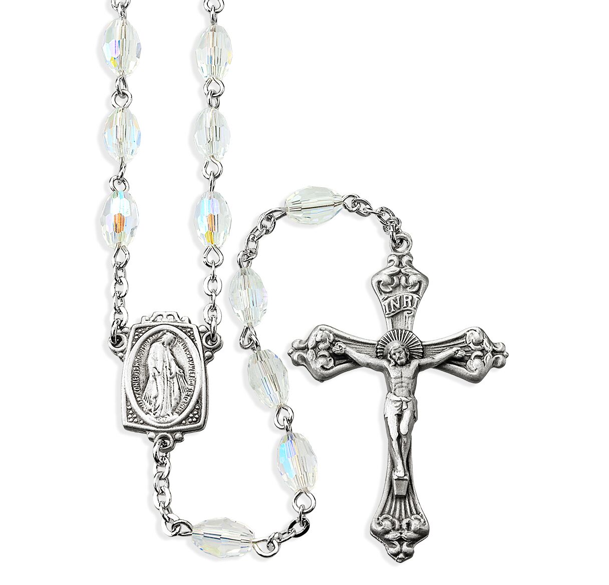 6x9mm Crystal Aurora Faceted Oval Glass Bead Rosary made with Genuine Pewter Crucifix and Centerpiece