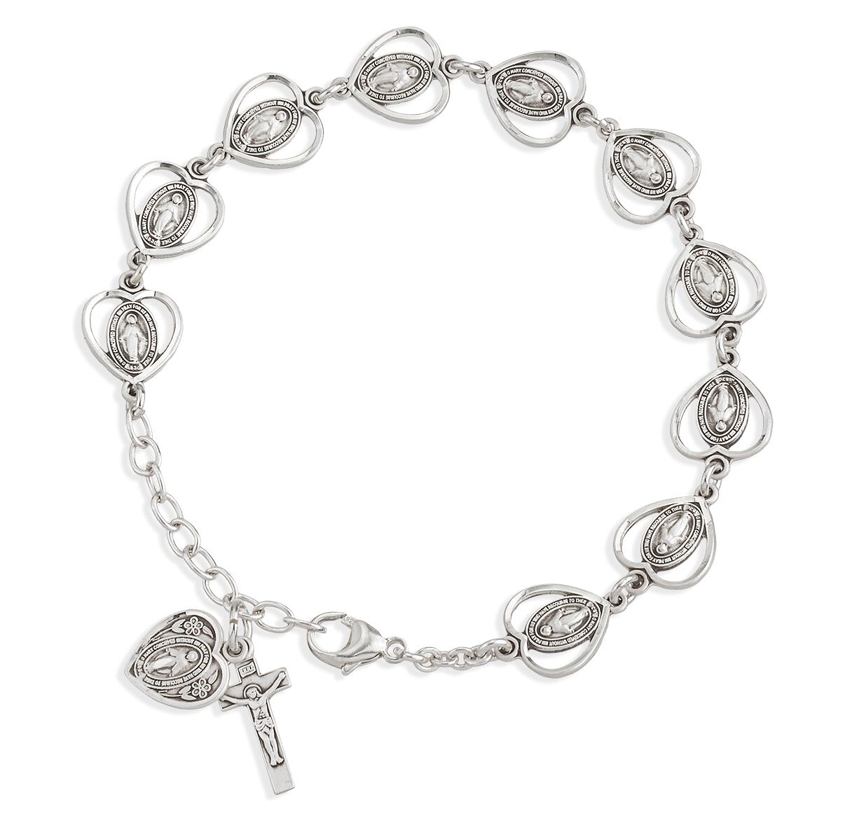 Sterling Silver Miraculous Medal Heart Rosary Bracelet