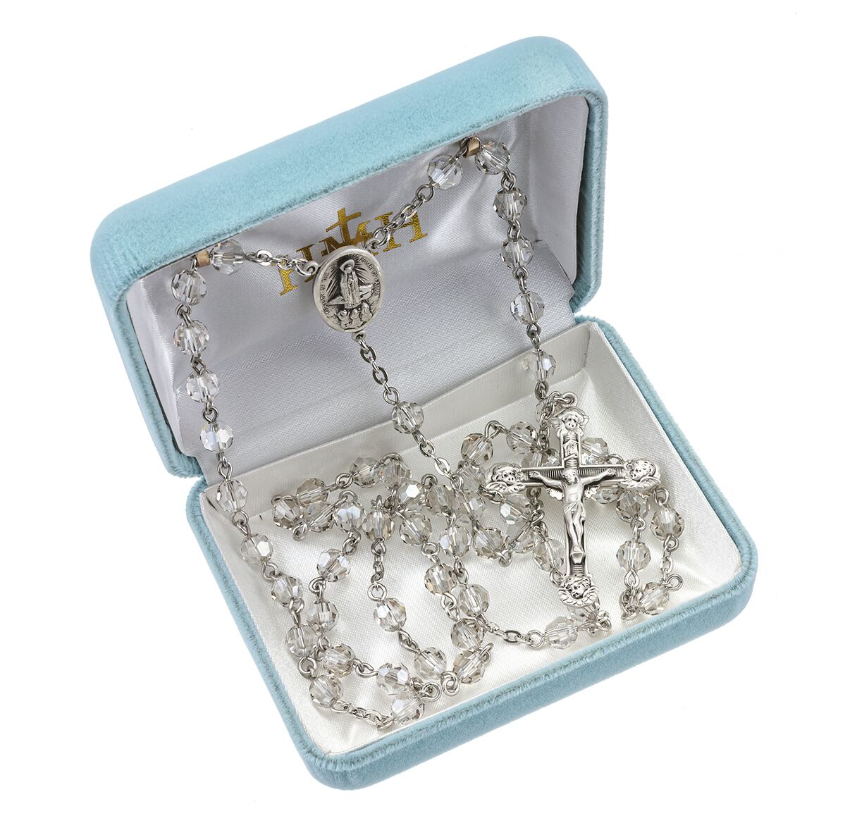 - Exclusive designed center and crucifix in sterling silver.